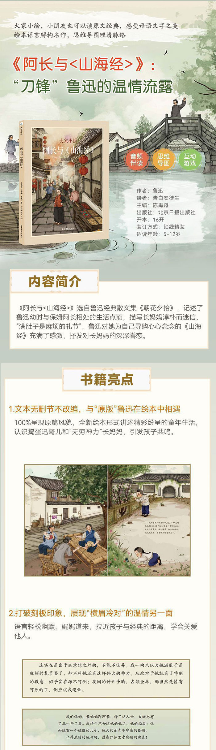 5岁 能读懂的大师作品,生动流畅的绘本语言带领孩子自然进入文学氛围,重温大文豪笔下的纯真童年和淳朴乡情! 文本入选统编版小学语文课本,经典故事全新图画演绎,思维导图启蒙逻辑思维! 大家小绘系列新品新形式,升级益智游戏、思维导图两大互动板块,提升阅读专注力!