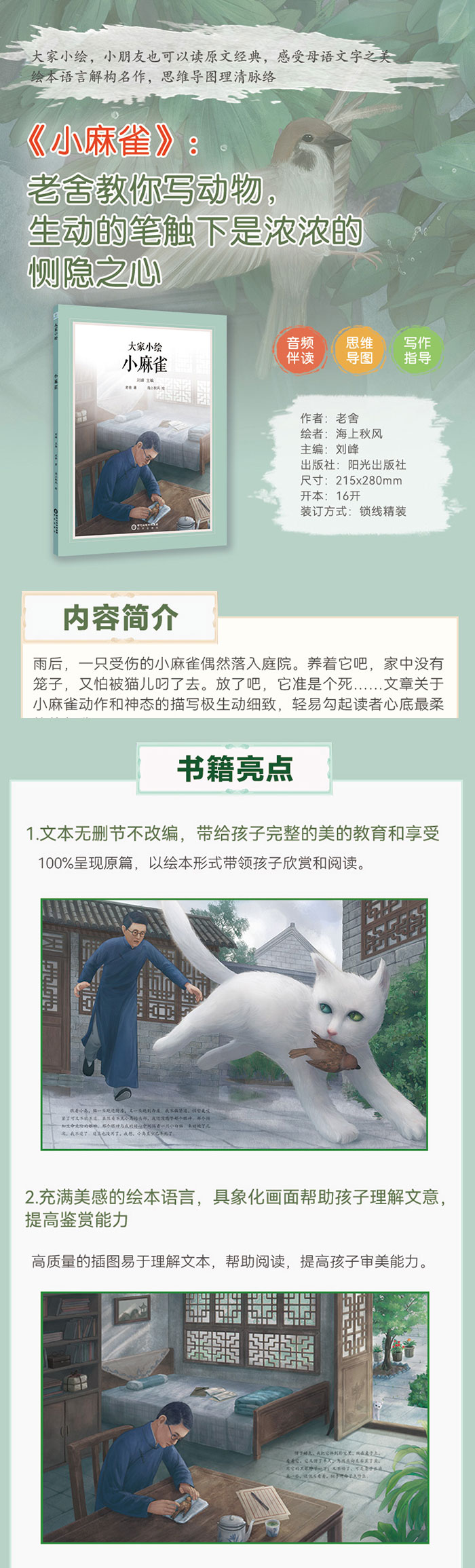 人民艺术家老舍教你写动物; 阅读经典,提高写作能力,保有恻隐纯真之心; 笔触细致生动,将文本视觉化展现; 同系列绘本已销百万册;