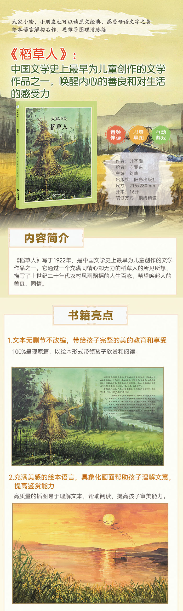 《稻草人》写于1922年,是中国文学早为儿童创作的文学作品之一。它通过一个充满同情心却无力的稻草人的所见所想,描写了上世纪二十年代农村风雨飘摇的人生百态,希望唤起人的善良、同情。