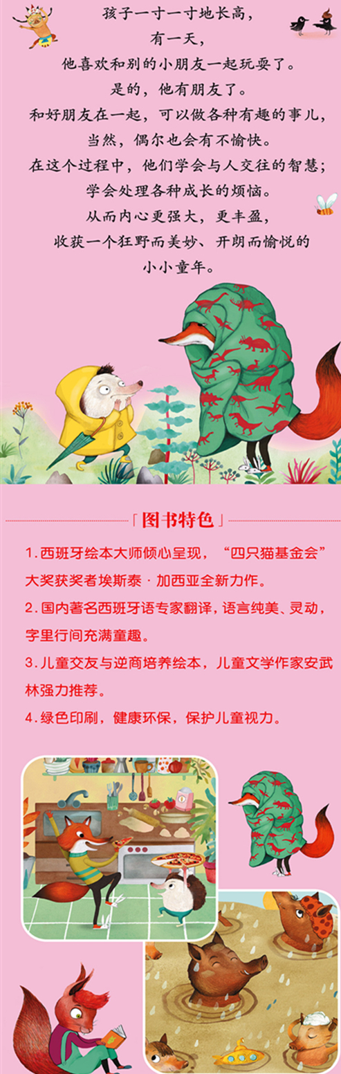 2.友谊是伴随孩子一生的财富,暖萌活泼的小狐狸和小刺猬,灵动诠释友情的珍贵,引领孩子学会交友和享受友谊。