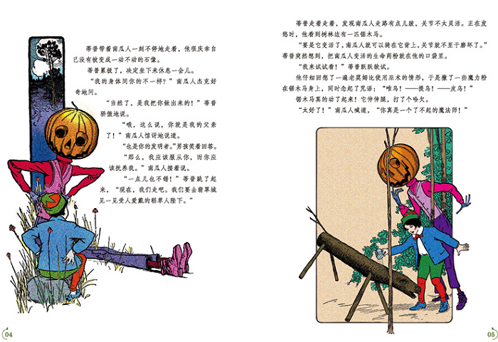 《南瓜人》聪明的小男孩蒂普做了一个南瓜人,本想用来吓唬邪恶的老巫婆莫姆比,却意外地被她拿来做了生命药粉的试验品,使得南瓜人变活了。男孩偷了莫姆比的生命药粉,和南瓜人一起逃跑了,在路上他用生命药粉变活了一匹锯木马,他们骑着他来到了翡翠城。那里的稻草人国王正面临着一场由女孩子发起的暴动,当他和朋友们向其好朋友温基国皇帝——铁皮人求救时,却屡次被老巫婆莫姆比用巫术设置的障碍所阻挡。他们能否克服重重障碍,取得成功呢……