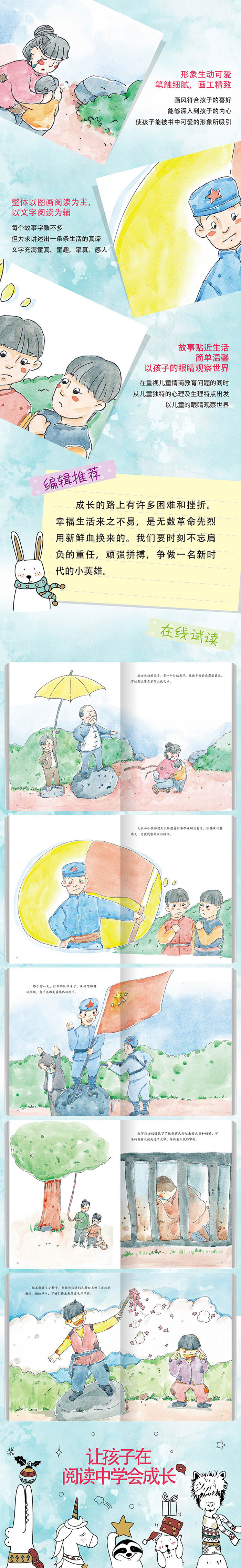 培养孩子不屈不挠,挑战困难的爱国精神故事中铁道游击队以少战多创造了许多的抗日英雄事迹。故事告诉孩子要铭记历史,珍惜现在,努力学习,敢于挑战困难,为祖国的富强添砖加瓦。这是一本原创儿童绘本,图文并茂,有教育意义。书中所选的小朋友的坏习惯和遇到的事例都是孩子们在成长中会遇到的,非常贴近生活。家长们可以为孩子阅读故事,让孩子们融入其中,感同身受,从而达到学习成长的效果。是成长期小朋友阅读的良选。故事简介情节完整,有极强的代入性,潜移默化,帮助孩子健康成长。