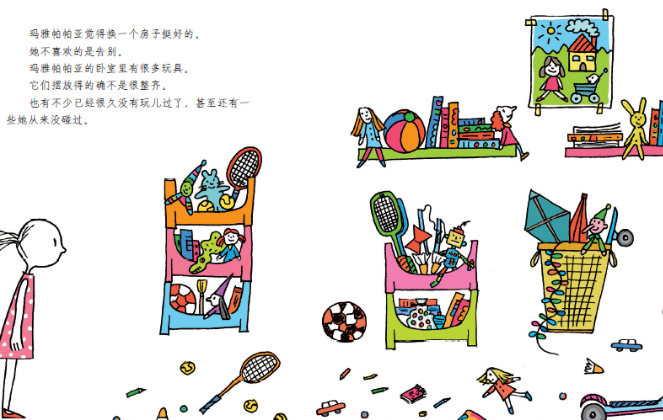 本册书系《玛雅帕帕亚》绘本系列六册中的最后一册。本系列从一个名叫玛雅帕帕亚的小女孩的视角来探索世界。玛雅是一个开心的小姑娘,她一直在探索着她周围的世界,因为周围的世界于她来说具有着神秘的色彩。玛雅要搬家了。她感到不舒服,因为她即将要和非常熟悉的东西和地方说再见,然后去往另一个陌生的地方。而且,她要选择一些她要带到新家的玩具和衣服,扔掉那些坏的,留下那些不再用的。对于一个小女孩来说这是多么困难的抉择啊!在那个时候玛雅既生气又沮丧,直到她的爸妈向她解释说在新的房子中她会看到新的东西,比如她一直期盼得到的小鸟!本册书帮助孩子学会收纳,通过转移注意力、增加新鲜感的方式帮助孩子缓解离别熟悉的环境或事物可能产生的分离焦虑及难过的情感。
