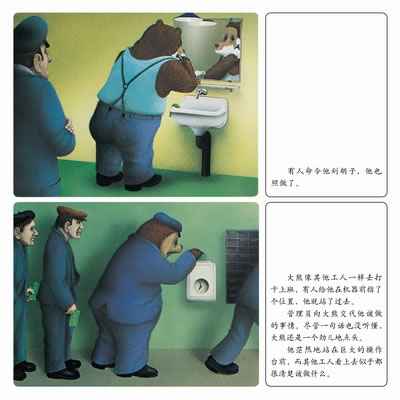 《森林大熊》是一个关于在现代文明中,人类对自我的迷失和找寻的寓言。冬眠的大熊一觉醒来,发现整座森林消失了,取而代之的是一个现代化的工厂。工厂管理员把大熊当做是偷懒耍滑的工人,喝斥他立刻开始工作。大熊一次次为自己辩解,却一次次遭到否定和嘲笑。于是他自己也渐渐动摇起来,忘记了自己究竟是谁,来自哪里……这个看似荒诞不经的故事拥有着震撼人心的力量,促使人们像大熊一样思索:在现代文明的惯性中,我们到底遗忘了什么?