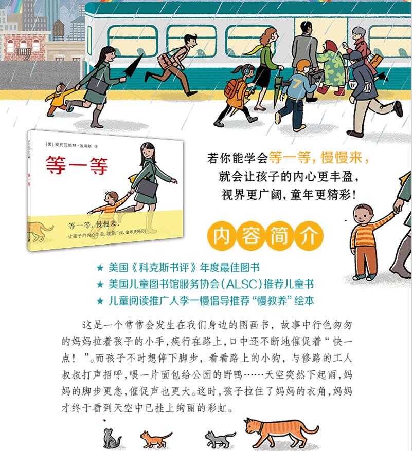 《等一等》是一本十分贴近日常生活的图画书,几乎每一位妈妈都有过类似的经历。成人需要面对工作、家庭的双重责任和压力,大多过着快节奏的忙碌生活;而孩童眼中的世界那样丰富多彩,需要他们花时间去细细认识、感受和学习,这就造成了一快一慢的矛盾。