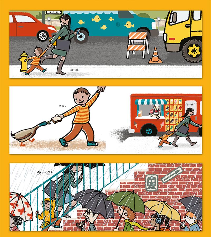 这是一个常常会发生在我们身边的图画书,故事中行色匆匆的妈妈拉着孩子的小手,疾行在路上,口中还不断地催促着“快一点!”。而孩子不时想停下脚步,看看路上的小狗,与修路的工人叔叔打声招呼,喂一片面包给公园的野鸭……天空突然下起雨,妈妈的脚步更急,催促声也更大。这时,孩子拉住了妈妈的衣角,妈妈才终于看到天空中已挂上绚丽的彩虹。