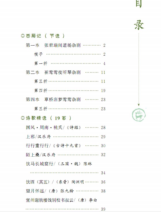 本书由古代诗词与古代经典散文构成,主要篇目有:《国风·桃夭》《上邪》《行行重行行》《陌上桑》《饮酒·结庐在人境》《饮马长城窟行》《望月怀远》《宣州谢朓楼饯别校书叔云》《勾践灭吴》《过秦论》等。全书图文并茂。