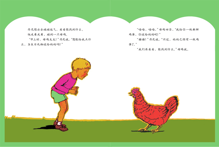 一路上,他遇到了母鸡、母鸭、山羊、绵羊和奶牛。大家都愿意帮他,可他们能给的妈妈都有。最后,丹尼找到熊先生,终于知道了该送什么给妈妈。