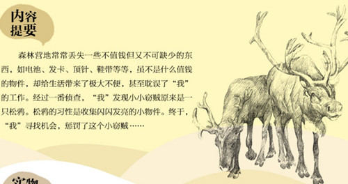 森林营地常常丢失一些不值钱但又不可缺少的东西,如电池、发卡、顶针、鞋带等等,虽不是什么值钱的物件,却给生活带来了极大不便,甚至耽误了“我”的工作。经过一番侦查,“我”发现小小窃贼原来是一只松鸦。松鸦的习性是收集闪闪发亮的小物件。终于,“我”寻找机会,惩罚了这个小窃贼……
