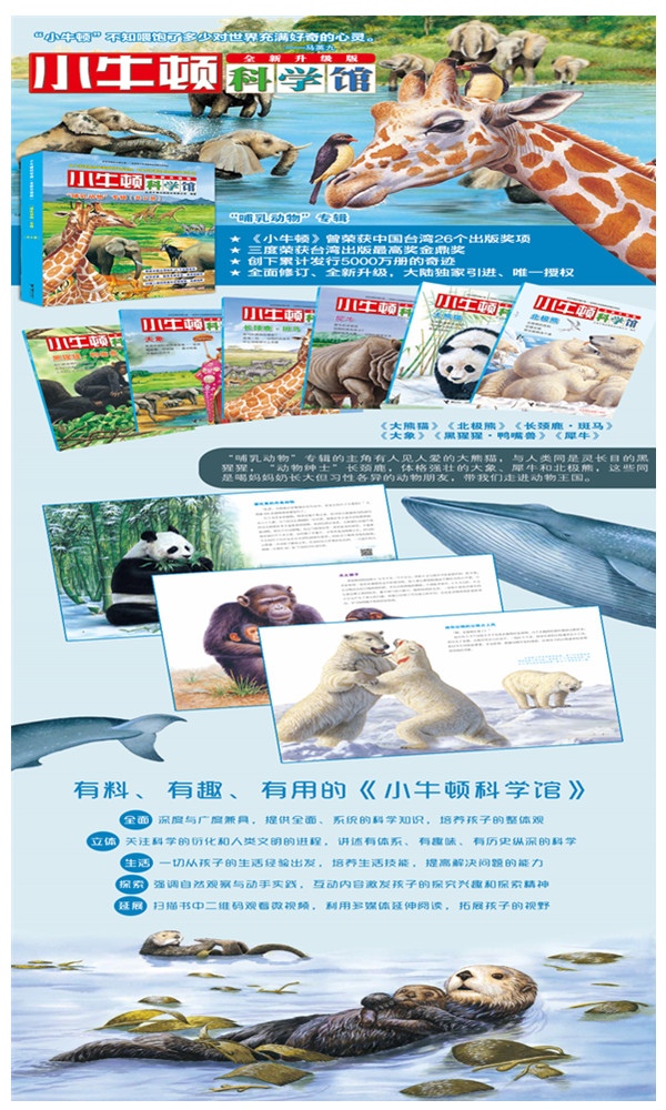 “小牛顿科学馆”礼盒装共30册,内容全面,培养孩子的整体观,带领孩子深入探索微妙的自然世界,了解科技文明的演进过程,获得系统的观念和知识。图文并解,超写实精细插画,透过剖面、透视等绘画技巧,充分展现事物原貌,让孩子轻松掌握观察重点。礼盒装包含5个主题专辑:宇宙的秘密、哺乳动物、神奇的大自然、餐桌上的食物、美好的生活。