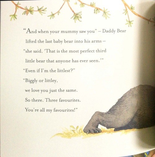 Mummy bear and Daddy bear tell their baby bears that they are the most wonderful baby bears in the whole wide world. But the baby bears start to wonder which of them their mummy and daddy like best. They can't all be their favourites...can they?