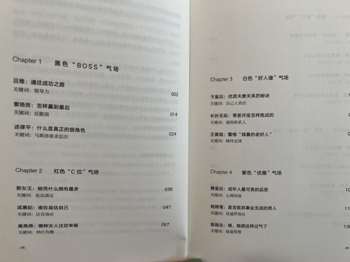 说到气场,不是“强大”就是“全开”,难道气场只有这一种类型吗?[1] 当然不是。气场融合了管理学、营销学、心理学、经济学等各种学科知识。它和情商一样,可以通过不断的训练和改造而有明显提升。 19位中国古代精英女性,以生动离奇的故事,诠释“气场色彩学”的6种特质:[1] 攻气十足的黑色“BOSS”气场,生命力满格的红色“C位”气场,容易相处的白色“好人缘”气场,天生敏锐的紫色“优雅”气场,沉着冷静的蓝色“知性”气场,明媚热情的黄色“第一印象”气场。 这些拥有强大“气场”的各色女性,她们有的是登基为王的女皇,有的是胸中藏有万卷书的才女,有的是驰骋疆场、挥洒热血的巾帼英雄,愿你在读故事的同时,能收获气场的修炼心法,轻松面对纷繁复杂的人生。