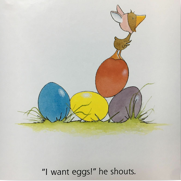 Gossie, Gertie, BooBoo, and Peedie are all dyeing Easter eggs. Ollie wants Easter eggs too and he has a plan on how he'll get them! Humor and vibrant ink-and-watercolor illustrations fill Olivier Dunrea's holiday follow-up to Merry Christmas, Ollie. Dunrea again gets the preschooler emotions exactly right, capturing a range of holiday-inspired feelings, from Ollie's wiggly impatience to be included to the pure joy of the older goslings discovering that Ollie has arranged the best Easter egg hunt of all.
