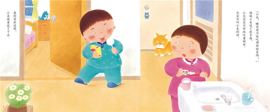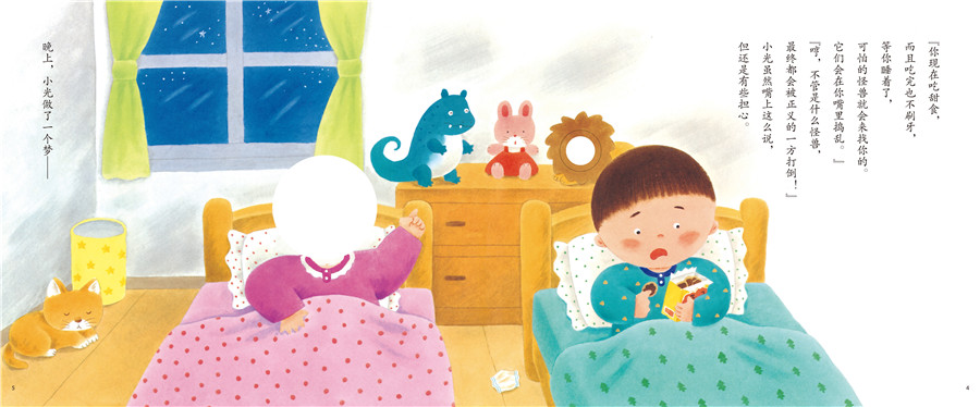 弟弟不爱刷牙,半夜的时候怪兽来了。怪兽还吐出了很多的小怪兽,把弟弟的牙啃了个稀巴烂。然后他们又要进攻姐姐的牙了。但姐姐是个爱刷牙的好孩子,当她的牙受到威胁的时候,牙齿超人来了,打败了怪兽,姐姐的牙齿被保护住了。这下弟弟终于明白了,也开始认真刷牙了。