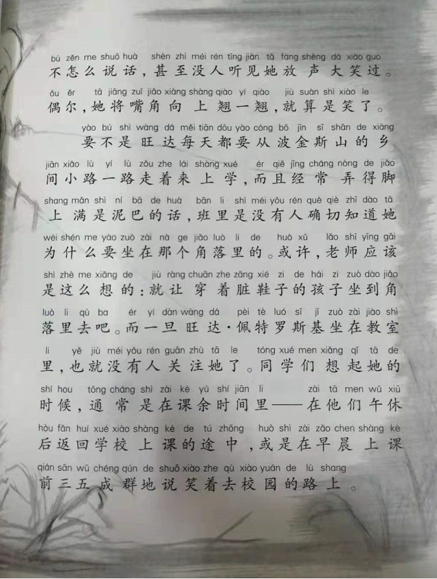 原来人们的清高,这些女孩子们的自以为是,是这么容易就可以被遏制的,所以这样的假清高、这样的漠视了别人的存在和自尊的不友善的姿态,在我们的每一天的生活里,在一个群体中,有必要存在着吗?不管她是不是乡下的,鞋子上总沾着泥;是哪一个国家的人,名字多么奇怪;或者是永远只穿着一条洗得褪了色的蓝裙子黄裙子……她都应该有自己的位置,有被平等接纳和交流的理由。我们不应该“看不见”他们。正像故事里的玛蒂埃一再警觉和担心的,你“看不见”他们,或者“看见”了却只知道奚落、嘲笑,那么很可能有一天你也会落到这苦恼的局面,尴尬和沮丧,最后只能像旺达那样默默离去,远走别处。旺达和她的爸爸没有办法啊。不是他们生活的那个波金斯山使他们没有办法过下去,而是人们的奚落、嘲笑使他们不可能过得开心。人是需要开心的。富人,有许多漂亮裙子的人需要开心;穷人,只有一条裙子的人也需要开心。