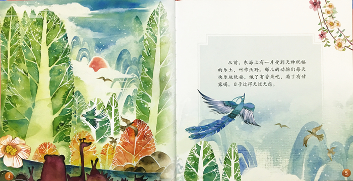 原来不起眼的凤凰默默地储存粮食,帮助森林的野兽度过洪水、大火等灾难,最终浴火重生,成为百鸟之王。