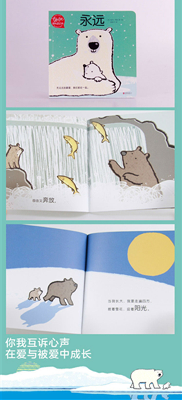《永远》选自暖房子亲子共读绘本《爱的表白书》。本书用可爱温馨、细腻舒畅的图画展现了北极熊亲子之间的日常生活场景:爱你我依偎相伴。