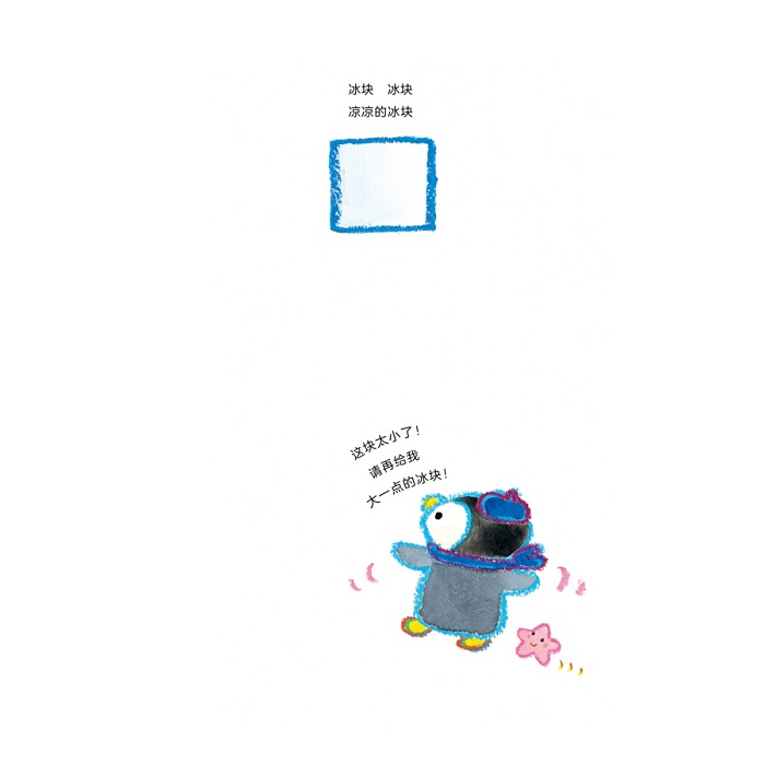 小企鹅在做刨冰,要做一个超大超大的刨冰!请给我大冰块,大点,再大点!好了,要准备好一个漂亮的玻璃杯!刷—刷—刷—,刷—刷—刷—再刨多点!再多点!做一杯美味果子露刨冰吧!草莓、白兰瓜、柠檬、橙汁、夏威夷风味……五颜六色都浇上去!哗啦,哗啦—小企鹅刨冰做好了!大家都来吃吧!