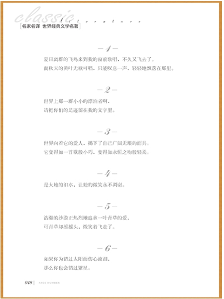 《飞鸟集》是泰戈尔的代表作之一,也是世界*杰出的诗集之一,包括300余首小诗。很多我们耳熟能详的小诗,如“生如夏花之绚烂,死如秋叶之静美”都出自该诗集。泰戈尔喜欢将哲理蕴含在自然中,在他的笔下,一只鸟、一朵花、一颗星,仿佛都被赋予了人性,充满了真理和智慧。