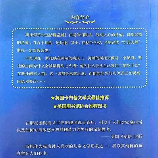 斯托一直是如此活蹦乱跳的,他善于鼓动人心、敢于冒险、直言不讳,而且是学校最“臭名远扬”的想象力超群的骗子。用他自己的话说,该称他为“空想大师”才是。但他现在躺在了医院的病床上,而他的好朋友、好哥们伊恩,正在观察、等待和回忆……