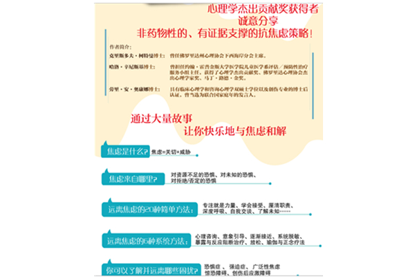 本书为心理学图书。每个人、每个家庭都不免有跟焦虑相关的事件。这是一本针对心理门外汉的自助书,笔调轻快,幽默,逻辑明晰,旨在帮助那些被焦虑困扰的人群。书中首先呈现了现在对焦虑的理解,大脑如何产生焦虑,焦虑的功能以及它在人类生存中的贡献,病理学的进展等。然后作者分章节介绍了五种主要焦虑症(恐怖症、惊恐障碍、强迫症、广泛性焦虑、创伤后应激障碍)的产生原因、结合实际例子讨论应对策略和克服这些焦虑症的练习,作者用很轻松的方式如歌词来帮助读者记住这些有用方法,当然作者提供的“工具箱”从简单到复杂的方式一应俱全。