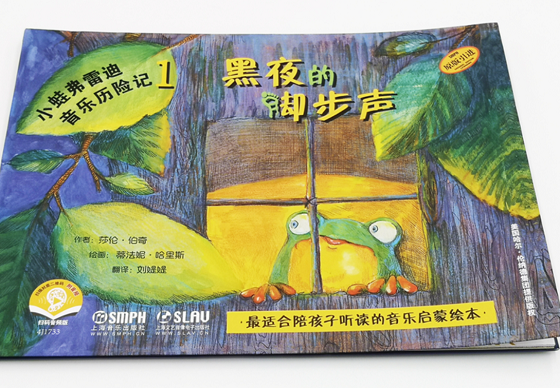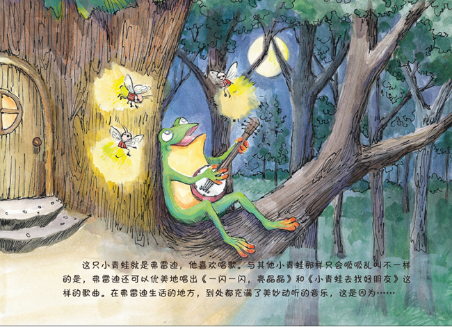 《小蛙弗雷迪音乐历险记》是一套针对学龄前儿童编创的音乐启蒙丛书,作者莎伦·伯奇(Sharon Burch)是美国儿童音乐早教委员会认证教师。这套丛书通过讲述小蛙弗雷迪在不同岛屿上的种种冒险经历,让孩子们在不知不觉中有了与音乐世界的第一次“亲密接触”。 音乐训练不仅是培养孩子艺术修养最为直接便捷的途经,也是促进思维能力和学习能力发展的重要手段。这套丛书从编创之初,就以“让没有专业音乐训练背景的家长也能陪伴孩子音乐启蒙”为目标,目的就是为了解决没有老师就无法带孩子进入音乐世界的问题。 有了这把开启音乐世界大门的“金钥匙”,孩子们一定能在小蛙弗雷迪刺激、惊险的大冒险中,体验到音乐的多彩和美妙。 小青蛙弗雷迪与爸爸妈妈生活在高音谱号岛上。有一天,他被夜晚奇怪的脚步声吵醒,于是决定勇敢走出自己居住的树屋,直面恐惧,去探索那声音究竟是什么……本篇的学习重点是五线谱的基础知识,包括中央C及所在八度的4个音符