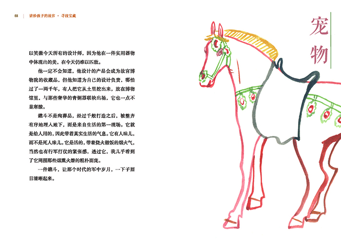 《讲给孩子的故宫:寻找宝藏》选取祝勇《故宫的古物之美》中与故宫里的珍稀古物相关、青少年读者感兴趣的10个主题(青铜器、酒器、动物、祭祀、军事、宠物、祭祀、艺术、家具、生活、服饰),每个主题下设置3个与国家宝藏有关、青少年熟悉且有趣的小问题。(如:“青铜器是青色的吗?”“《木兰诗》中‘朔气传金柝’的‘金柝’是什么?”“唐三彩中的马是胖的还是瘦的比较受欢迎?”) 作品以优美、凝练、专业的散文化语言,为青少年读者讲述一件件国家宝藏的前世今生,连缀起一部故宫里的艺术史,再现中华文明的营造之美。从而引领青少年更清晰地了解历史,掌握文博知识,更深入地体会博大精深的华夏文明