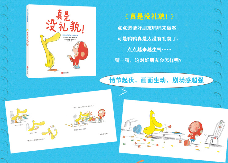 这套绘本分两册:《真是没礼貌!》《太自私了吧!》,讲述了鸭鸭和点点这对好朋友的故事。情节生动,插画清新幽默,小孩子不讲礼貌、自私不分享的表现栩栩如生地跃然纸上,就像一面镜子,让小读者仿佛看到自己的不恰当行为,并真正有“换位思考”的体验,了解不礼貌、自私行为给别人带来的困扰,从而习得良好的行为举止,并学会分享。《太自私了吧!》讲述的是鸭鸭和点点争抢玩具的过程,生动有趣,让小朋友体验自私不分享给别人带来的困扰,从而学会谦让与分享。