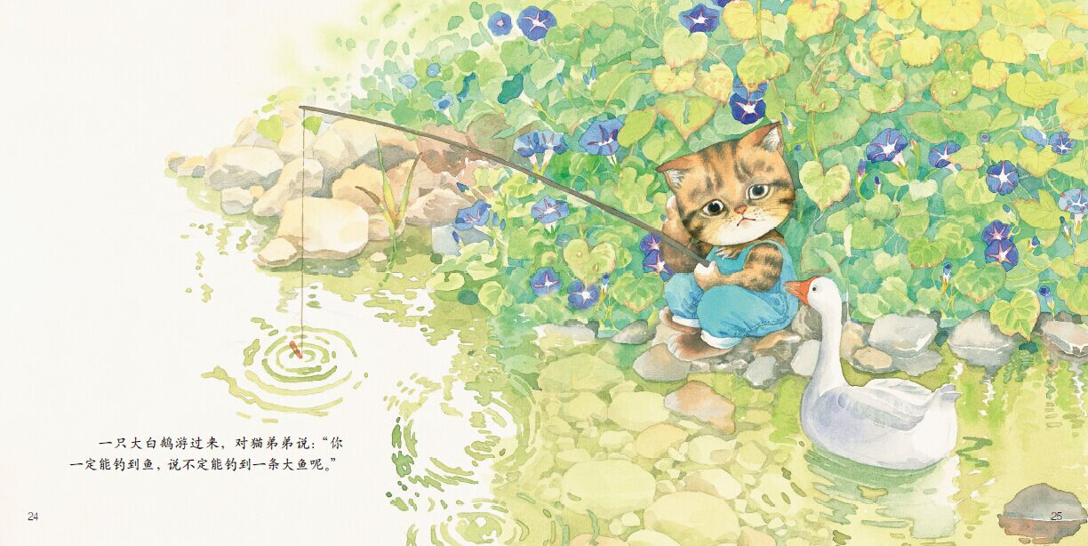 《小猫钓鱼》——小猫跟着妈妈和姐姐去钓鱼,但是鱼还没钓到,他就三心二意地坐不住了,一会儿去捉蜻蜓,一会儿捉蝴蝶。这样子当然是钓不到鱼的,他该怎么办呢?他到底钓没钓到鱼呢?