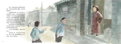林海音的《城南旧事•爸爸的花儿落了》是经典的成长故事。在脚本设计的过程中,我们就纠结和为难了很久。整个故事交织着现实和回忆,回忆的节奏很缓慢,现实的节奏却又有张有弛,怎么处理好呢?为了避免时空的交替造成读者的困惑,我们采用了约翰•伯宁罕式的处理方式——用不同的绘画语言来表达,一边是彩铅,勾连着有些游离的现实,一边是水彩,承载着清晰的回忆。在必要的时候,在对页的画面上加以关联,街道从现实延伸到回忆中,屋檐又从回忆里爬进现实的那一半,亦真亦幻,就像成长本身。尽管我们对自己的作品还并不满意,但在试读时一个四年级的男孩高度肯定了这本图画书,因为他喜欢里面的成长。有什么比读者喜欢更令人高兴呢?
