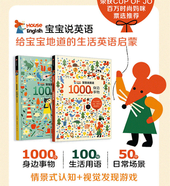 基础篇《1000个身边事物》涵盖数字、颜色、形状、身体部位、水果蔬菜、动植物等30大主题,侧重于词汇量的积累和初步认知训练,帮助宝宝认知生活中的常见事物,熟悉相应的英语表达。进阶篇《100句生活用语》在难度上有所提升,选取20大日常主题场景,如厨房、浴室、卧室、花园、动物园、游乐场、游泳池等,侧重于复合型词语和短句的使用,让宝宝了解英语中简单的形容词、方位词、数量词的使用方法,轻松掌握地道口语。