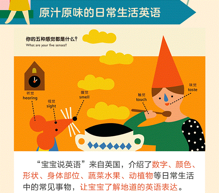 “宝宝说英语”系列来自英国,是英国经典童书出版社WIDE EYED的看家之作,荣获欧美时尚生活方式网站CUP of JO(相当于国内的“小红书”)百万粉丝的票选推荐,内容非常丰富详实,所介绍的词汇都是贴近日常生活实景的。