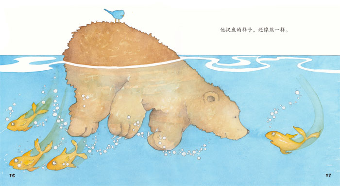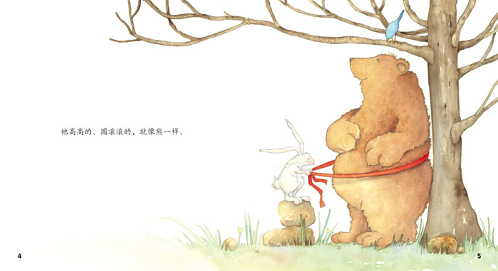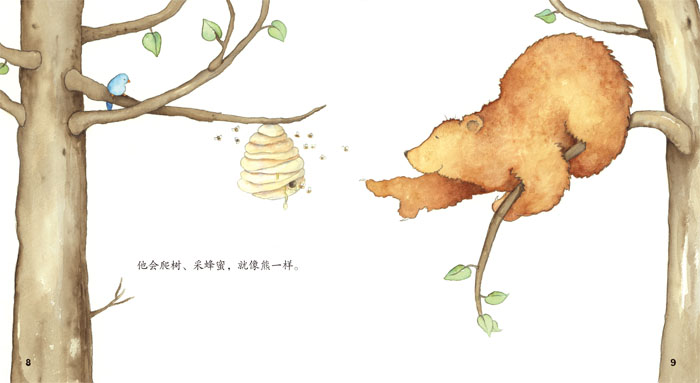 《我的爸爸是头熊》:我觉得我的爸爸是一头熊,因为他像熊一样块头很大、身材圆滚滚的,还像熊一样会爬树、会采蜜、会靠着大树挠后背,就连睡觉的样子都想熊一样。不过,爸爸告诉我这都不是他最擅长的事情,他最擅长的是给我一个“熊抱”。