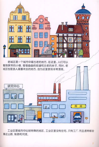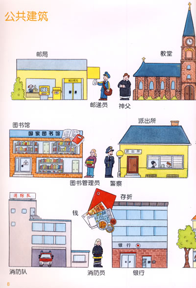 中描绘了城市里面不同场景中的事物,有公交站、火车站、飞机场、港口、超市、商场等等,同时有大量的对应词语