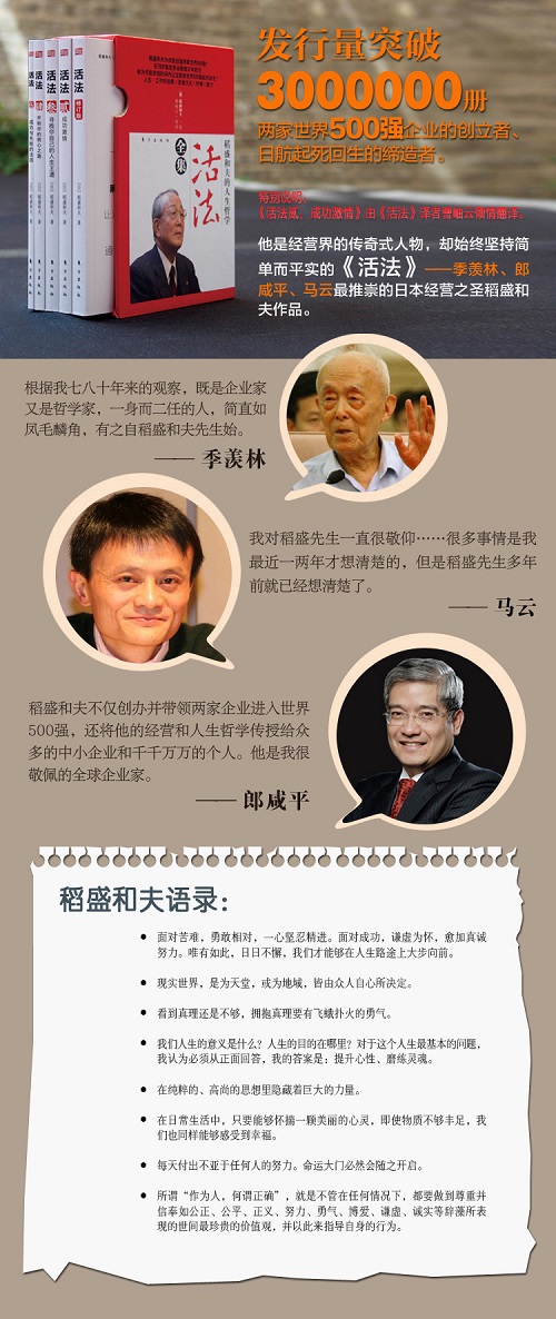 《活法贰:超级企业人的活法》:稻盛和夫在本书中回顾了几十年来的经营心得,并将成功的条件归纳为能力、努力和态度。作为两家世界500强企业的创立者,稻盛和夫在本书中的观念早已经超越了单纯的企业经营,上升到了探讨“企业与人性的关系,人的本质是什么,企业发展到最后到底为了什么?”这样的高度。作为一位优秀的企业家,稻盛和夫无疑给正在寻求企业发展之道及努力完善企业德行的企业家们指引了一条光明之路,为无数职场与企业中人指明了通向成功的活法。