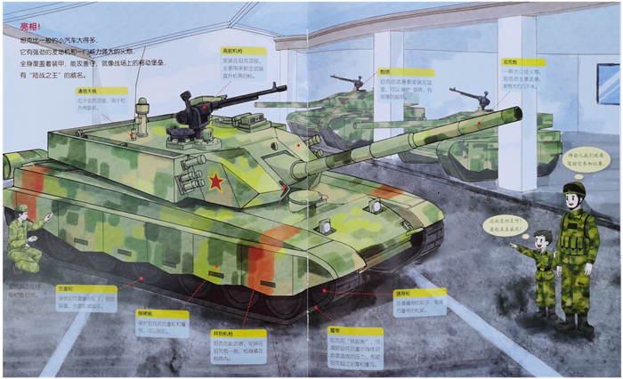 国内首套“中国军事科普绘本”“主角”是国产新式海陆空装备和军人。500余幅手绘大图剖析装备结构。15个兵种、100余种新装备、多种任务场景、千余知识点,让孩子了解国防知识,一眼看懂原理,爱上军事。 《坦克,冲呀!》远处传来发动机启动的声音,坦克比赛就要开始了!