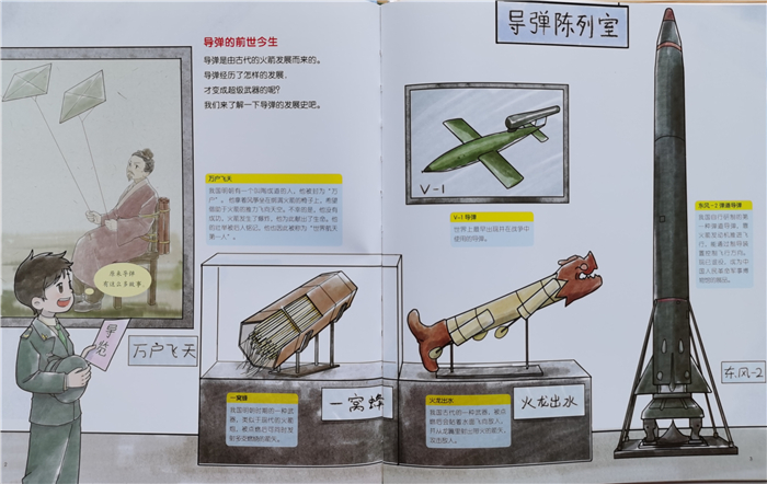 国内首套“中国军事科普绘本”“主角”是国产新式海陆空装备和军人。500余幅手绘大图剖析装备结构。15个兵种、100余种新装备、多种任务场景、千余知识点,让孩子了解国防知识,一眼看懂原理,爱上军事。 《导弹,发射!》点火,发射!一个浑身黑亮的大家伙起飞了。它喷出熊熊火焰,像一把飞向天空的利剑。这就是威力强大的武器——导弹。