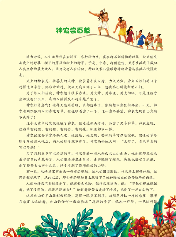 神农是天上的神仙,他看到人们的生活很艰难,就决定来帮助他们。他教会了人们种粮食,使他们能生存下去。为了治疗人间频发的疾病,神农不辞劳苦地跋山涉水亲尝草药,了解它们的用途,他自己*终为此献出了生命。