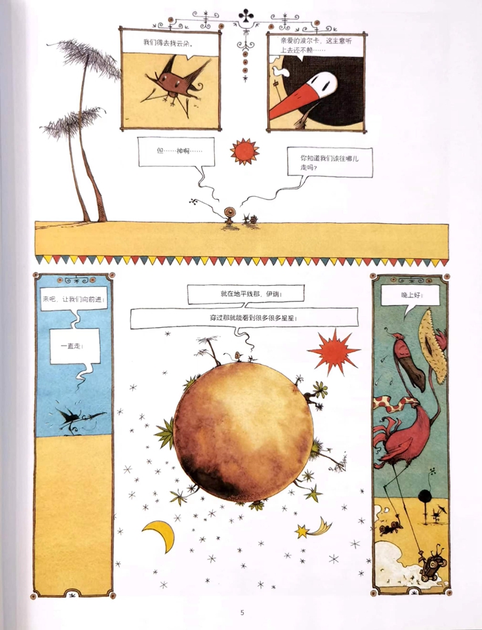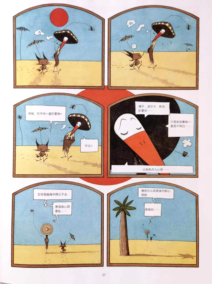 在一个靠近太阳的国度里,一只瘦瘦高高的鹳和朋友——一只爱管闲事小狐狸,在干涸的大地上绝望地等待这雨水。不幸的是,这两个口渴难耐的朋友被刺眼的阳光炙烤着,蓝天中却见不到一片云彩……于是他们决定出发寻找沙漠中的绿洲。作品中常常引经据典,如拉伯雷的《巨人传》等。漫画兼具幽默与诗意,仿佛主人公穿越沙漠时是抒情写意的。书中的“椰子香味”和中国的“望梅止渴”有异曲同工之妙,都可视为我们在人生漂泊的旅途中的精神支 柱。