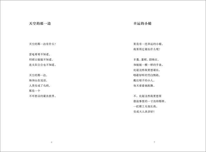 想要变成云、无忧无虑在天空中飘荡,想要把暖和的羽绒被送给小狗、松树和小草,眼巴巴等着邻家的杏树结果、终于得到了两颗杏子……金子美铃笔下的孩子们的世界是天真烂漫的,也隐隐有着朦胧的哀愁。她借天真烂漫的童语歌咏故乡的景物和生活,温暖轻柔的笔调中包含着绮丽的幻想和深刻的哲思。