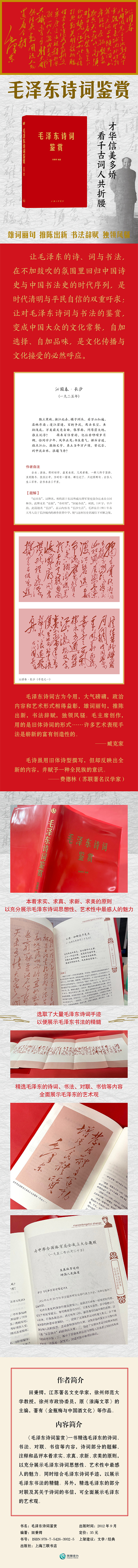 本书主要是对诗词和书法作品的欣赏和评析,包括了所作的诗、词、对联、部分相关书信以及书法手迹作品。书中主要侧重非政治形态的艺术鉴赏,有利于读者全面了解,比较全面地展示了*的艺术观。