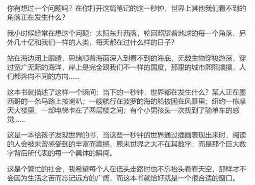 《一秒内的世界》是一本既富有乐趣,又充满哲理的儿童绘本。通过本书,作者向我们展示了这一秒钟世界上发生的千百万件有意思的事情,许许多多不同的风土人情,特别适合3~6岁的小朋友与爸爸妈妈一起亲子共读,也许在丰富的画面中,小朋友还能发现更多有意思的细节。