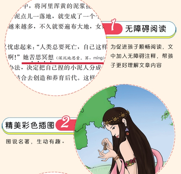 有一天,女娲来到河边洗脸。忽然,她发现澄澈(chéng chè,清澈透明)的水中除了平时常见的小鱼外,还有一个忽隐忽现的影子。女娲冲这个影子笑,这个影子也冲她笑;她皱眉,影子也跟着皱眉;她离开水边,招呼影子随她过来,影子却没了。女娲灵机一动,心想:“世间各种生物都有了,偏偏没有和我一样的生物。如果能创造出像我这样的生物来,这个世界肯定会变得很热闹。”
