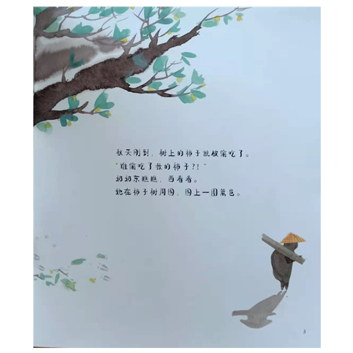 这是一本适合2—6岁儿童阅读的传递现代分享观念的图画书,讲述了一位独居老人守护一棵柿子树的故事。秋天刚到,奶奶的柿子就被偷吃了,她在树旁发现了大大小小的脚印,从强壮的野猪、到活泼的小鹿,再到小小的老鼠……奶奶与各种臆想中的动物们斗争,她的生活也变得热闹起来。所以,当她保护了柿子,赶走了动物们,高兴过后却有些失落。于是,奶奶做了一个暖心的举动,把树上剩下的柿子留给了动物们。