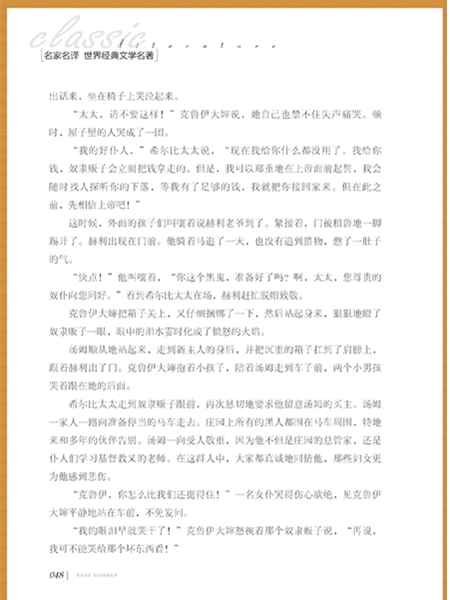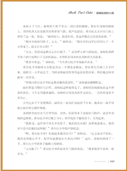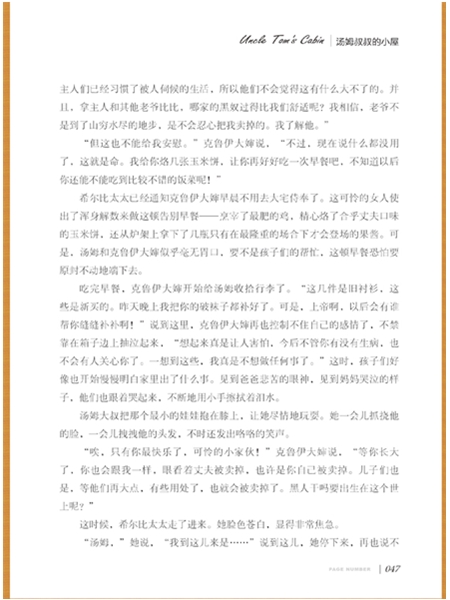《汤姆叔叔的小屋》的主人公黑奴汤姆叔叔信奉基督教,逆来顺受,并不愿反抗奴隶制,最后惨死在奴隶主的手里。而他的朋友,黑奴伊莉莎和她的丈夫哈里斯,从一开始就具有反抗精神。为了不让自己的儿子被卖掉,伊莉莎带着儿子逃跑了。这本书通过对汤姆和哈里斯夫妇这两种不同性格黑奴的描述,告诉我们,逆来顺受、听从奴隶主摆布的汤姆难逃死亡的命运,而敢于反抗敢于斗争的乔治夫妇得到了新生《汤姆叔叔的小屋》对社会发展起到了巨大的积极作用。
