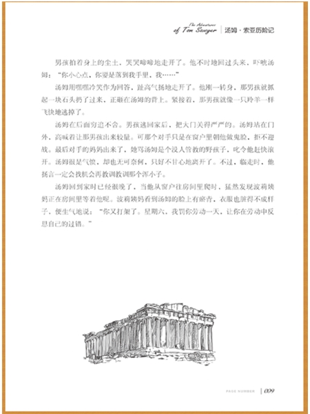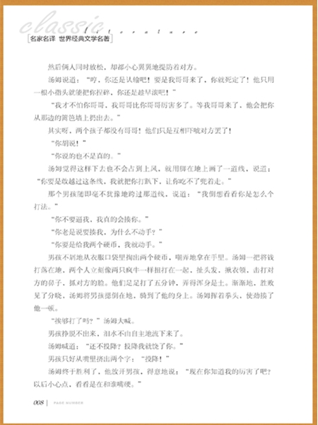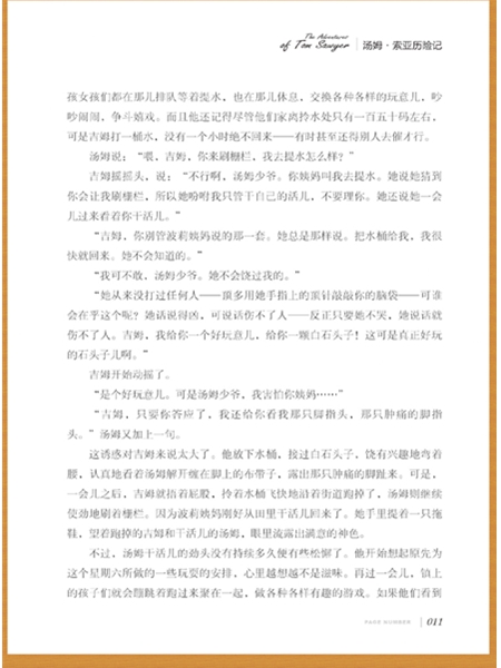 《汤姆.索亚历险记》的故事发生在密西西比河畔一个小镇上,小主人公汤姆.索亚天真活泼、不堪束缚、追求自由,厌恶枯燥的功课和刻板庸俗的生活环境,梦想着过海盗式的冒险生活。在一次意外中他和他的好朋友哈克贝利目击了一桩杀人命案,并最终战胜了恐惧,勇敢地站出来揭发了凶残的犯罪人,保护了无辜遭殃的镇民们。在这一过程中,他们凭自己的聪明机智破解了强盗们的藏宝之谜,并最终找到了宝藏,赢得了镇民的赞赏与敬佩。