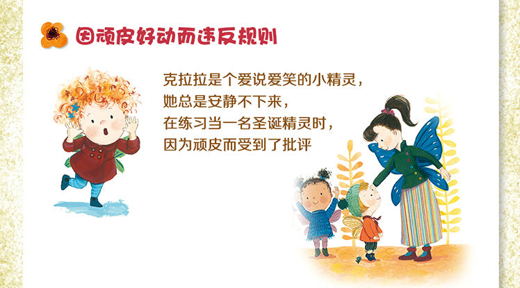 克拉拉是个爱说爱笑的小精灵,她总是安静不下来,在练习当一名圣诞精灵时,因为顽皮而受到了批评