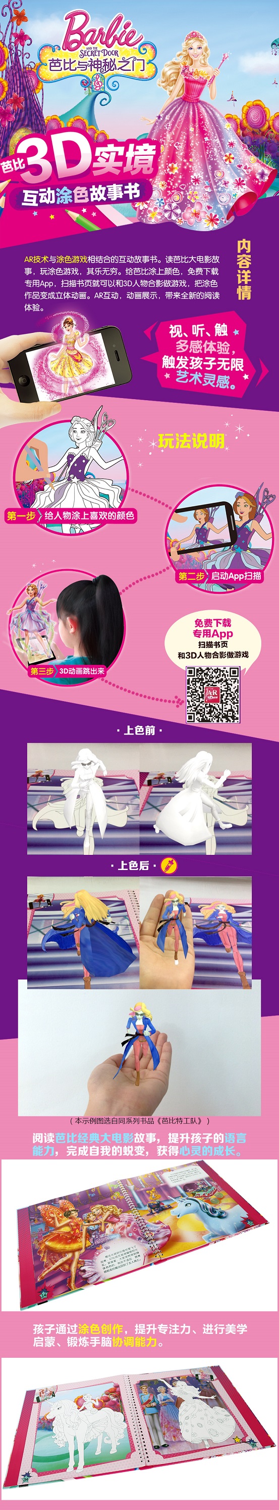 AR技术与涂色游戏相结合的互动故事书。读芭比大电影故事,玩涂色游戏,其乐无穷。给芭比涂上颜色,免费下载专用App,扫描书页就可以和3D人物合影做游戏,把涂色作品变成立体动画。80个AR互动,80个动画展示,带来全新的阅读体验。