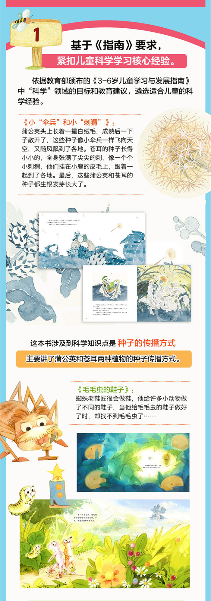 《探索吧!科学!——幼儿科学启蒙经典绘本》丛书共10册,分2辑,精选了10个科学启蒙经典童话,通过生动的语言、精美的图画、有趣的知识、好玩的游戏、奇妙的视频等,全方位地介绍发生在孩子身边的科学现象,帮助孩子更好地认识大自然,萌发科学探索意识,提高科学素养。 第2辑包括《小“伞兵”和小“刺猬”》《太阳哥哥和月亮妹妹》《毛毛虫的鞋子》《冬天的小鱼》《特别的“气象员”》,具体内容如下: 《小“伞兵”和小“刺猬”》这本书涉及到科学知识是种子的传播方式。蒲公英的头上长着一撮白绒毛,成熟后一下子散开了,这些种子像小“伞兵”一样飞向天空,又随风飘到了各地。苍耳的种子长得小小的,全身长满了尖尖的刺,像一个个小刺猬,他们挂在小鹿的毛上,跟着小鹿到处旅行。后,这些蒲公英和苍耳的种子都生根发芽长大了。 《太阳哥哥和月亮妹妹》这本书涉及到的科学知识是日月运动规律。白天,太阳挂在空中,把大地妈妈照得暖洋洋的,给大家带来了光和热,也带来了欢笑。到了晚上,月亮妹妹去接太阳哥哥的班。月亮来到了天空,把银色的光芒洒向大地,照亮了小鸟回家的路……嗬,太阳又跳出了海面,新的一天又开始了。