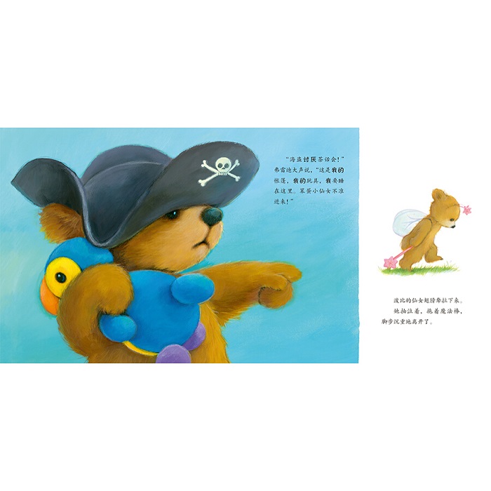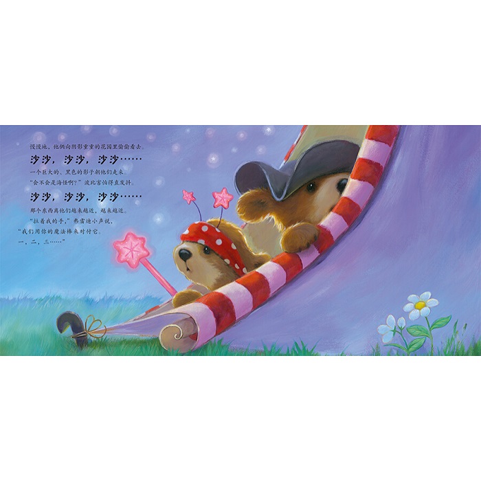 《海盗不怕黑》 勇敢的“船长”弗雷迪要在他漂亮的海盗帐篷里过夜啦。 爱惹麻烦的小妹妹波比也想加入进来,他大喊着:“小仙女不准来!” 可是当手电筒熄灭,黑暗中传来沙沙沙的声音时,弗雷迪就没那么勇敢了……